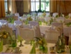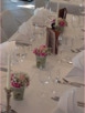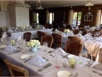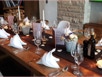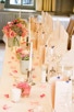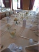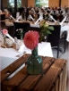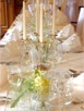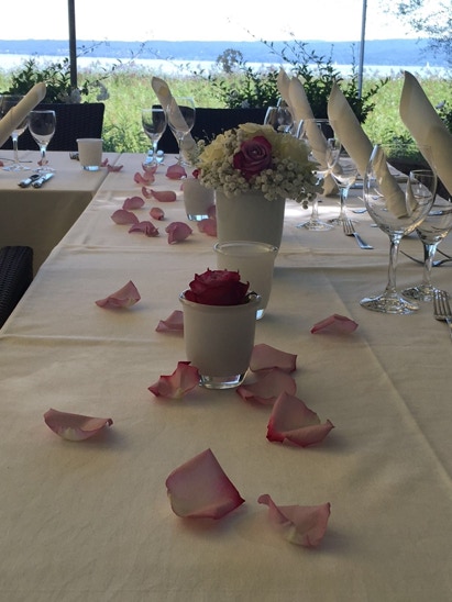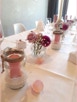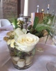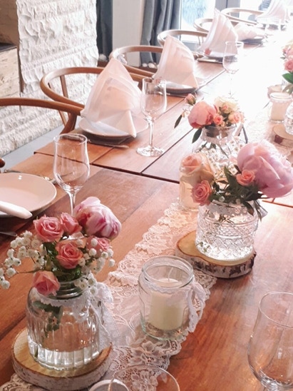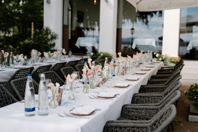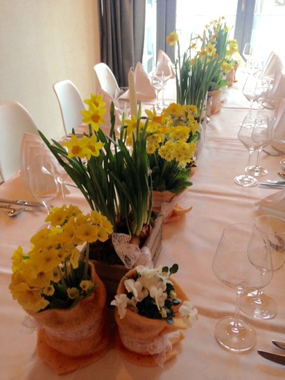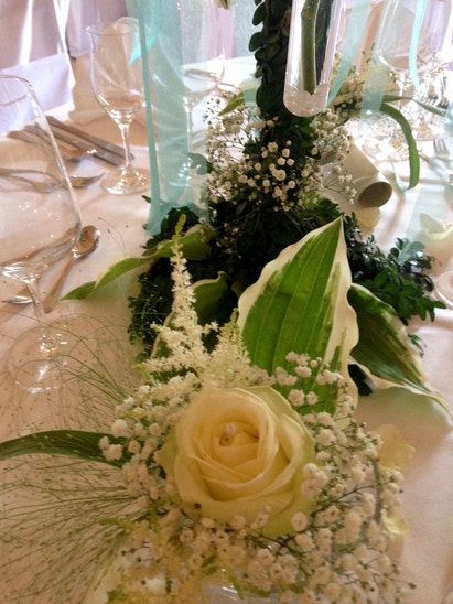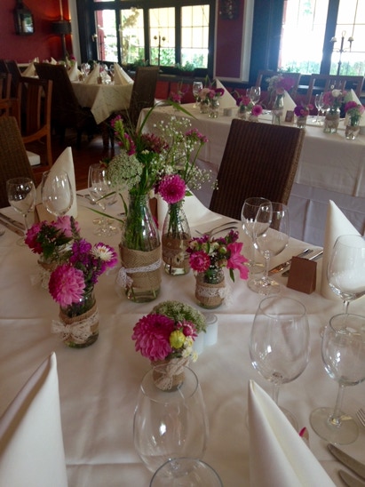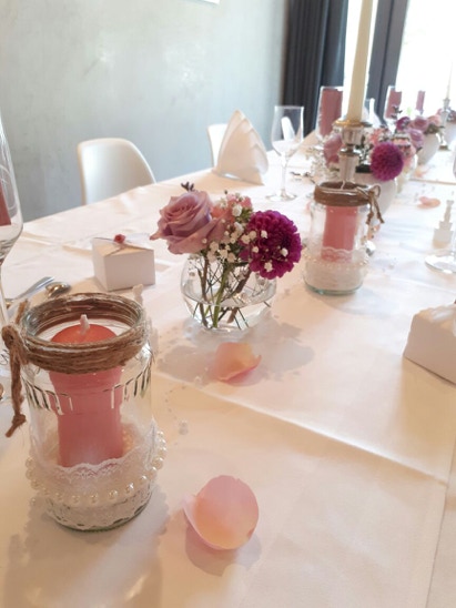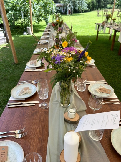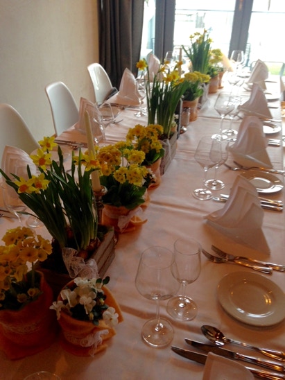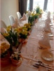 Bei einer länglichen Tafel bietet sich auch ein schmales und längliches Tischgesteck an.